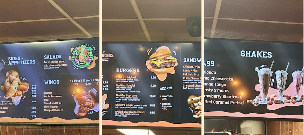 Most items at Sheikhs N Burgers range from $8 to $20. The average price is around $7.86, making it budget-friendly for a delicious meal.