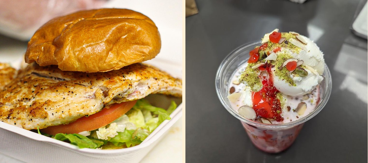 The restaurant is known for its Chicken over Rice, various Gyro Sandwiches, and unique burgers like the Sheikh's Zinger Burger. Don't miss their Falooda shake for a refreshing dessert!